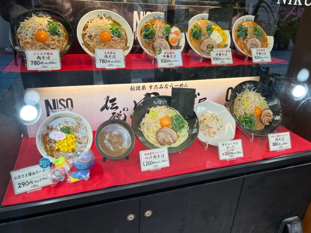 看板には「伝説系 すたみならーめん」「唯一無二」の文字がデカデカと掲げられている。店頭にはサンプルがズラリと並んでいた。