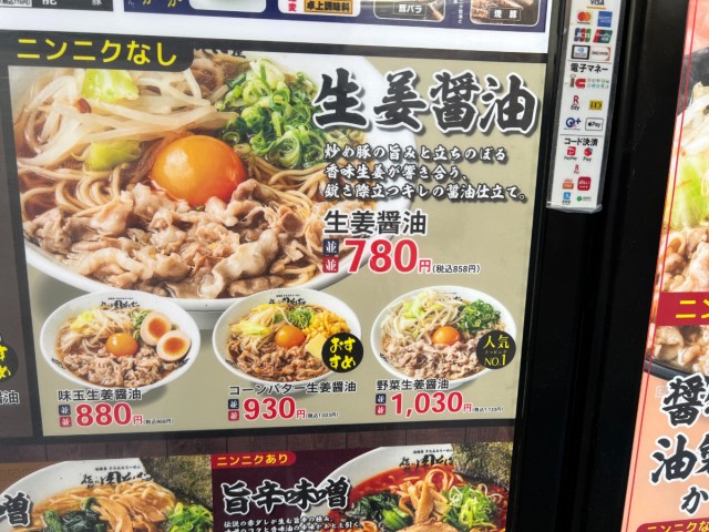 まずは店頭のメニューに目を通す。基本となるのは「ニンニク醤油肉そば」で、並サイズが税込858円。それ以外にも、ニンニクなしの「生姜醤油肉そば」や「旨辛味噌肉そば」など、バリエーションも豊富だ。