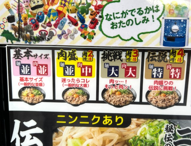 「基本サイズ」は麺並・肉並。「肉盛」は肉2倍。「挑戦」は肉3倍で麺も大サイズに。そして最上位に君臨するのが「伝説」……肉4倍、麺も特サイズという、まさに “伝説” の名を冠するにふさわしい最重量級メニューだ。しかも「肉盛りの伝説に挑戦!」というキャッチフレーズが、完全にこちらを煽りにきている。