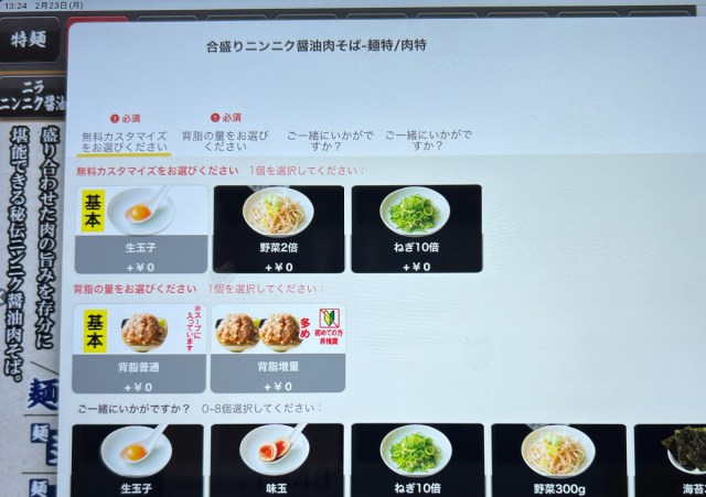 タブレットの注文画面では無料カスタマイズが選べる。生玉子・野菜2倍・ねぎ10倍の中から1つ選べて、さらに背脂の量も選択可能。初めての方は背脂増量が「非推奨」とのことだが、今回はデフォルトの背脂普通で。そしてトッピングには「ねぎ10倍」(税込110円)を追加した。