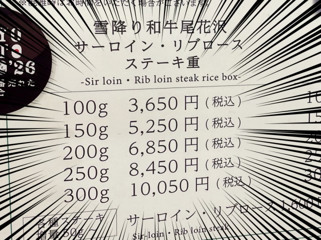そう、つまり3650円(税込)の弁当が最安なのである! ここだけ物価がニューヨーク……!! 量は50グラム単位で増やすことができ、300グラムで10,050円(税込)とのこと。一体どんな人が買うんだ。
