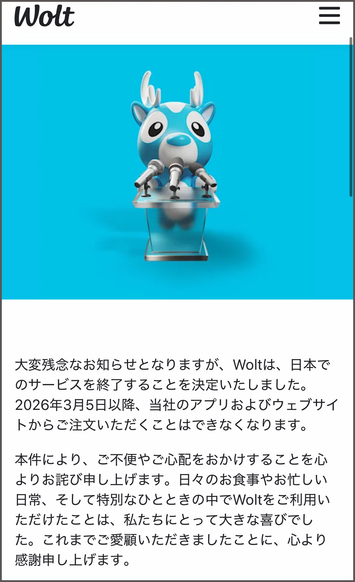 フードデリバリーサービスの「Wolt」が日本からの撤退を表明した。なんでも、2026年3月5日以降はアプリやWebサイトで注文できなくなるとのこと。3月4日まではギリ使えるわけだが……中にはこう思う人だっているに違いない。