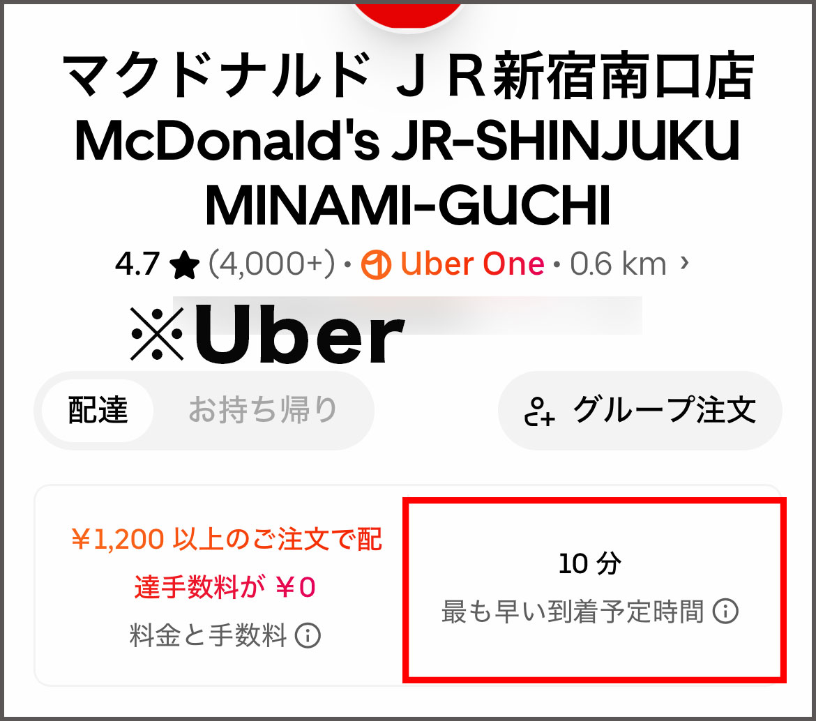 今回はマクドナルドのJR新宿南口店で、フードデリバリー限定メニューを注文してみる。まずUber Eatsの場合、追加料金が発生する優先プランを使わずに、スタンダードプランだと到着までに10分程度だった。