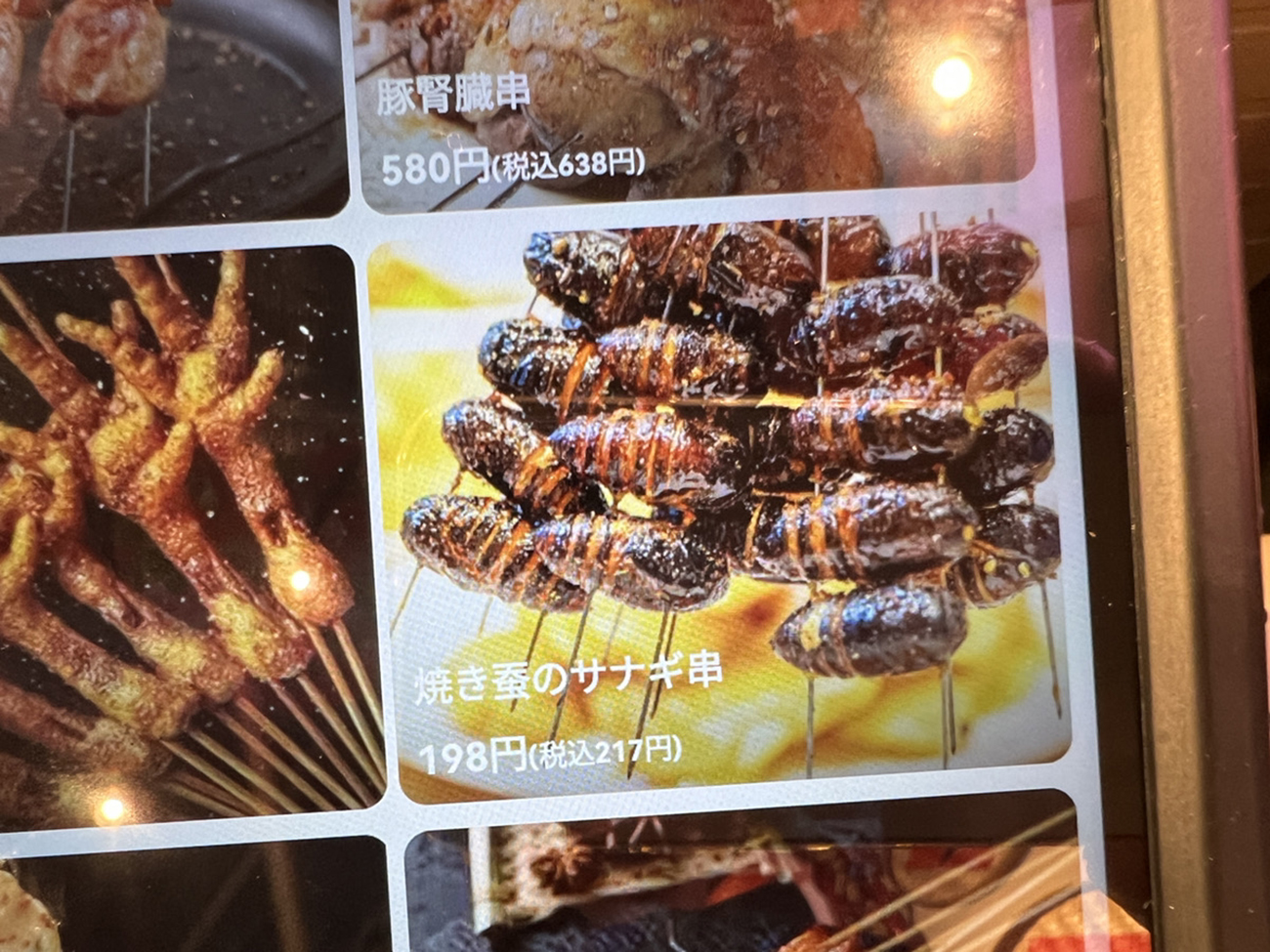 「焼き蚕のサナギ串」である。茶碗蒸し、水煮と様々な蚕を食べてきた私だけど、串焼きは初めてだ。これいっとかないとダメだろ。