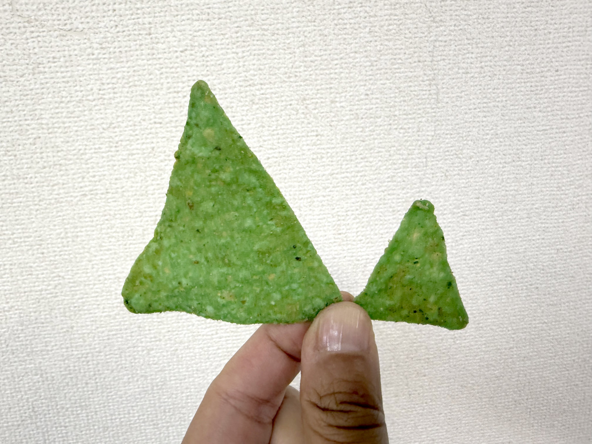 さっそくパッケージを開けてみると、ドリトス本体がビックリするほどグリーン! グリーングリーン!! あまりにも鮮やかなグリーンは、海外のわさびのようなやや蛍光みのあるグリーンである。