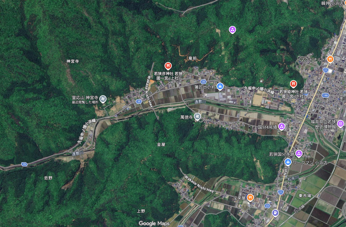 当時は35号を超え、遠敷川のほとりまでが境内だったようす。35号はかつての鯖街道として知られていますが、実は鯖街道もお寺から見て川を超えたところを通っていたそうです。