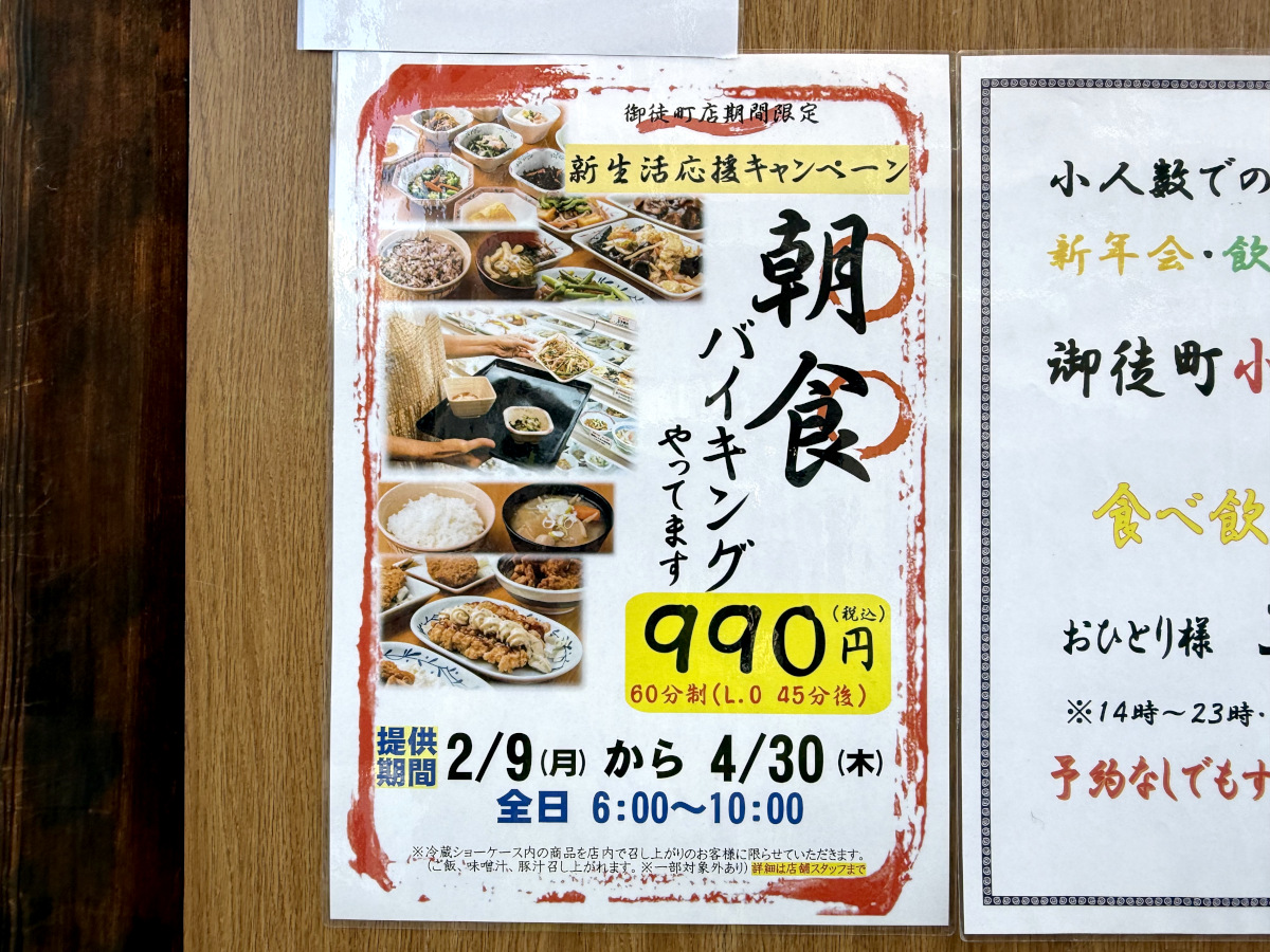 複数のXのポストを見てみると、ショーケースから自分で取る式の「御徒町小町食堂」が、朝食のみ990円でバイキングを開催しているとのこと。期間は2026年4月30日までで、毎日朝6時から10時まで実施しているらしい。