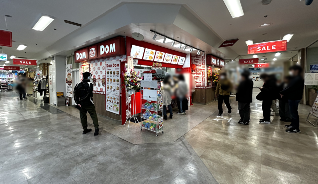 一角だけぴかぴかで、花もたくさん飾られているところがあり、そこがドムドムだった。店前には少しだけ列ができていたが、大混雑というワケでもなさそうだ。お昼時を過ぎていたこともあり、少し落ち着いてきたところなのだろう。