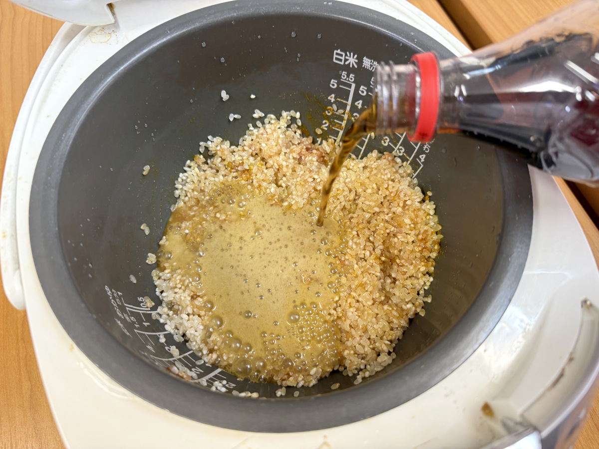 ジェミニによるとポイントは「常温のコーラを使うこと」だそう。「冷たいコーラだと炊きムラが出ます」と、得意顔で話していた。ふふん、食べたこと無いくせに。で、実際の炊き上がりはというと……
