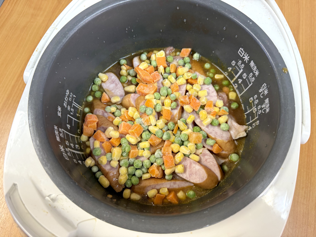 3. 鶏肉・ソーセージ・ミックスベジタブルを投入する。