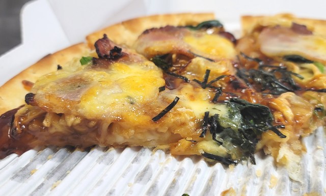 正直、第一印象は「家系ラーメンピザ」というより照り焼き系のピザに近かった。だが噛みしめているうちに、慣れ親しんだ豚骨醤油のキレのある風味が口内に広がり、何とも不思議で心躍る感覚がこみ上げた。