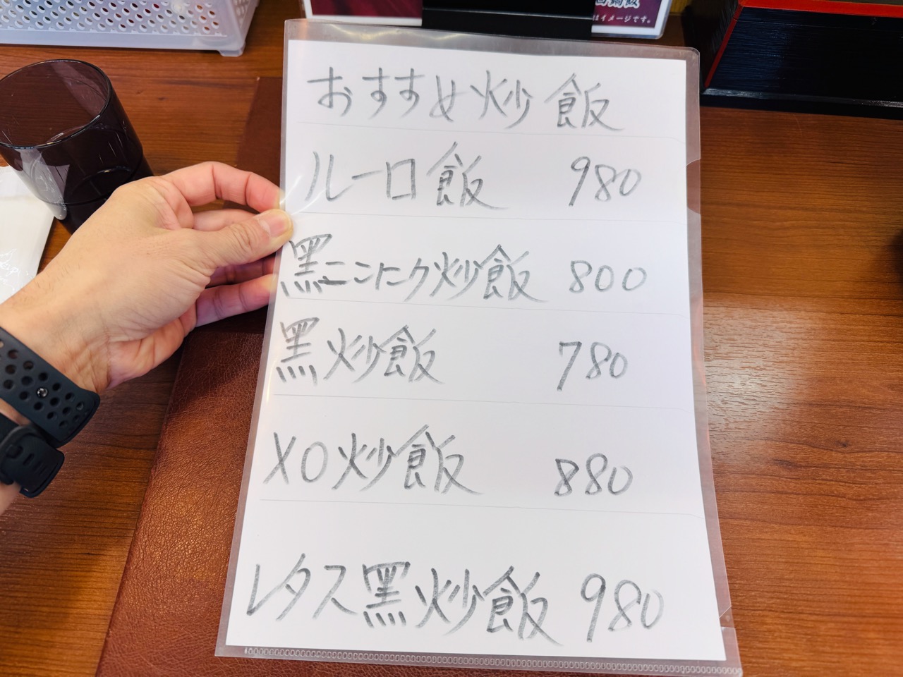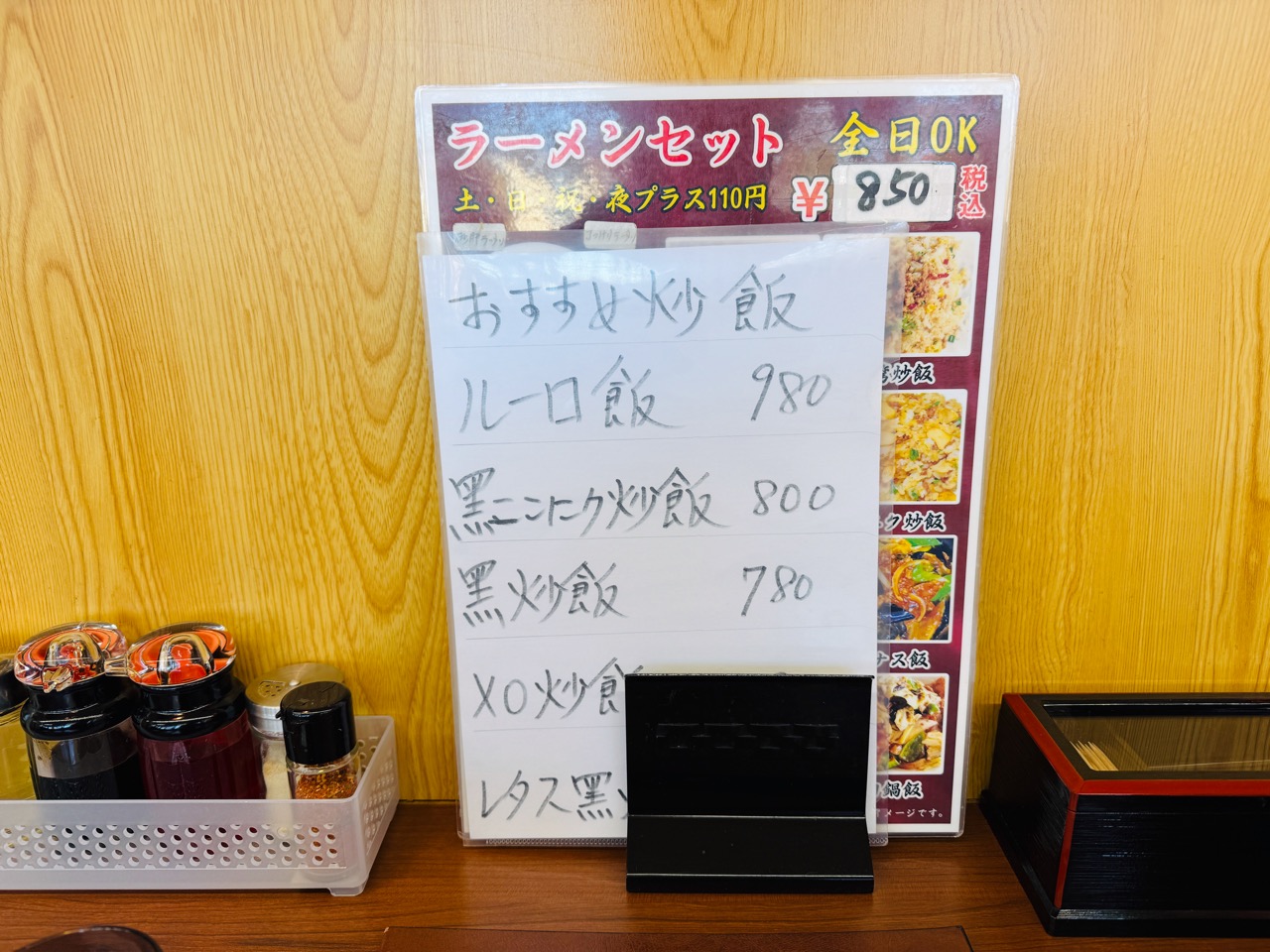 目の前には少しゴージャスなメニュー。それを手に取ると、奥から「おすすめ炒飯」と書かれたパウチの紙が出てきた!
