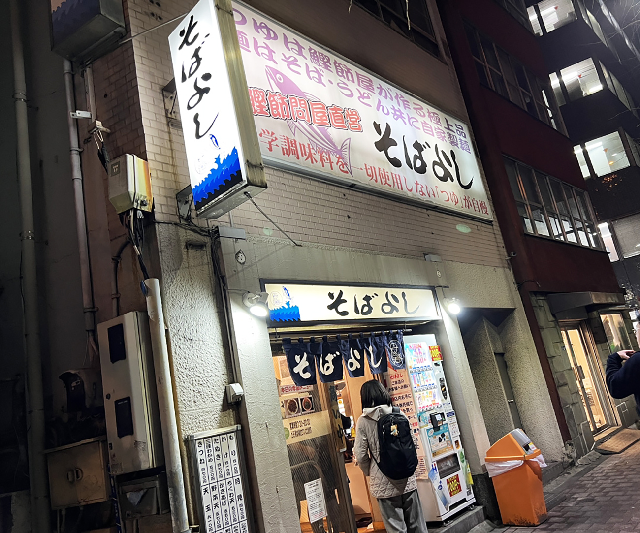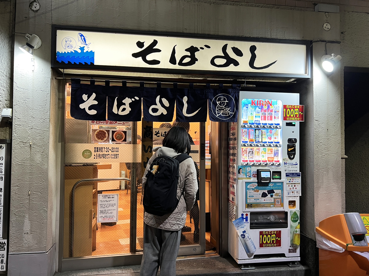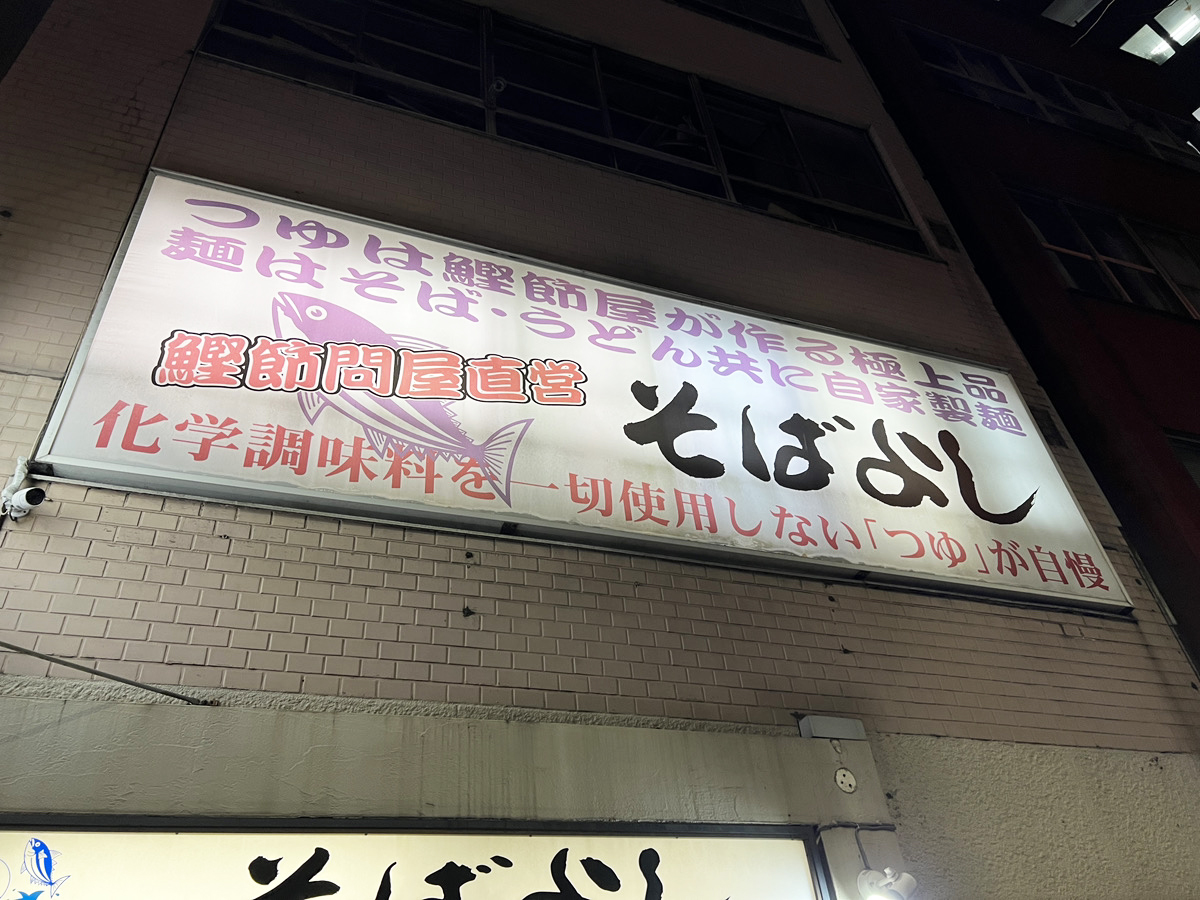 鰹節問屋直営の立ち食いそば屋である『そばよし』。看板に「化学調味料を一切使用しないつゆが自慢」と書かれているだけあって、鰹の風味が強烈なつゆは都内屈指の出汁パワーと言っていいだろう。そのそばの味は、かつてタモリさんが「日本一の立ち食いそば」と絶賛したことでも知られている。