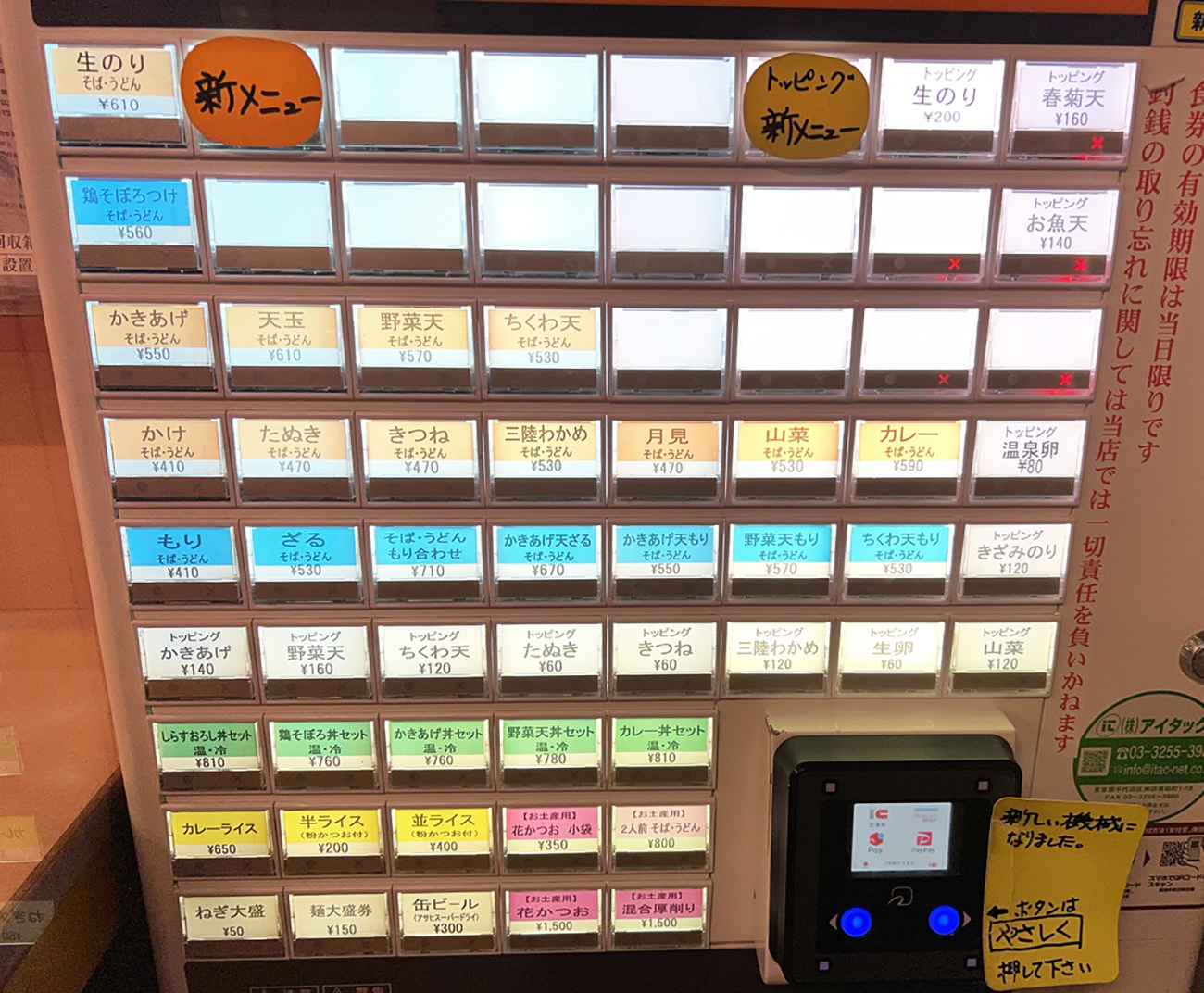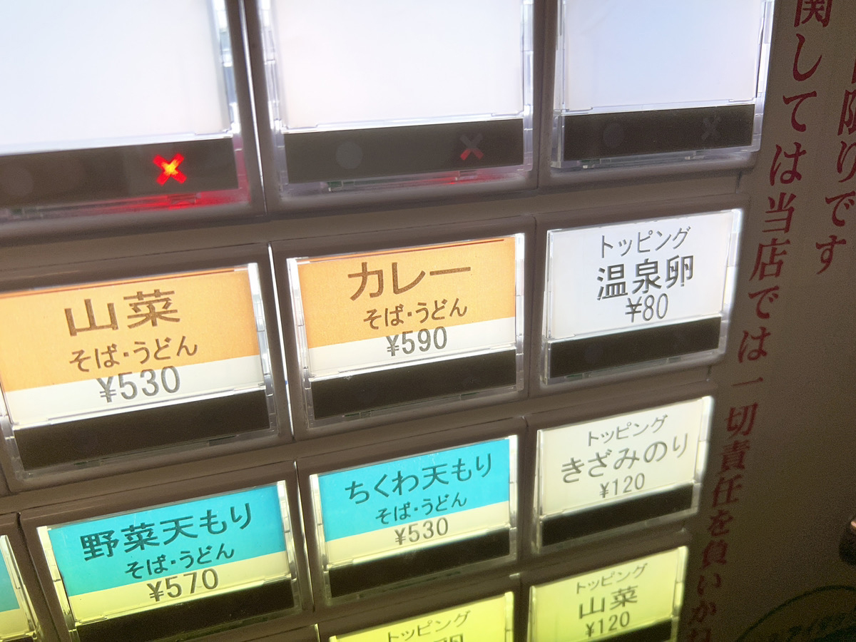 と、ここまで書いてしまうと日本橋だし高そうにも感じるのだが、そこは立ち食いそば屋。カレーそばは税込590円で、何気にカレーライス(税込650円)より安い。