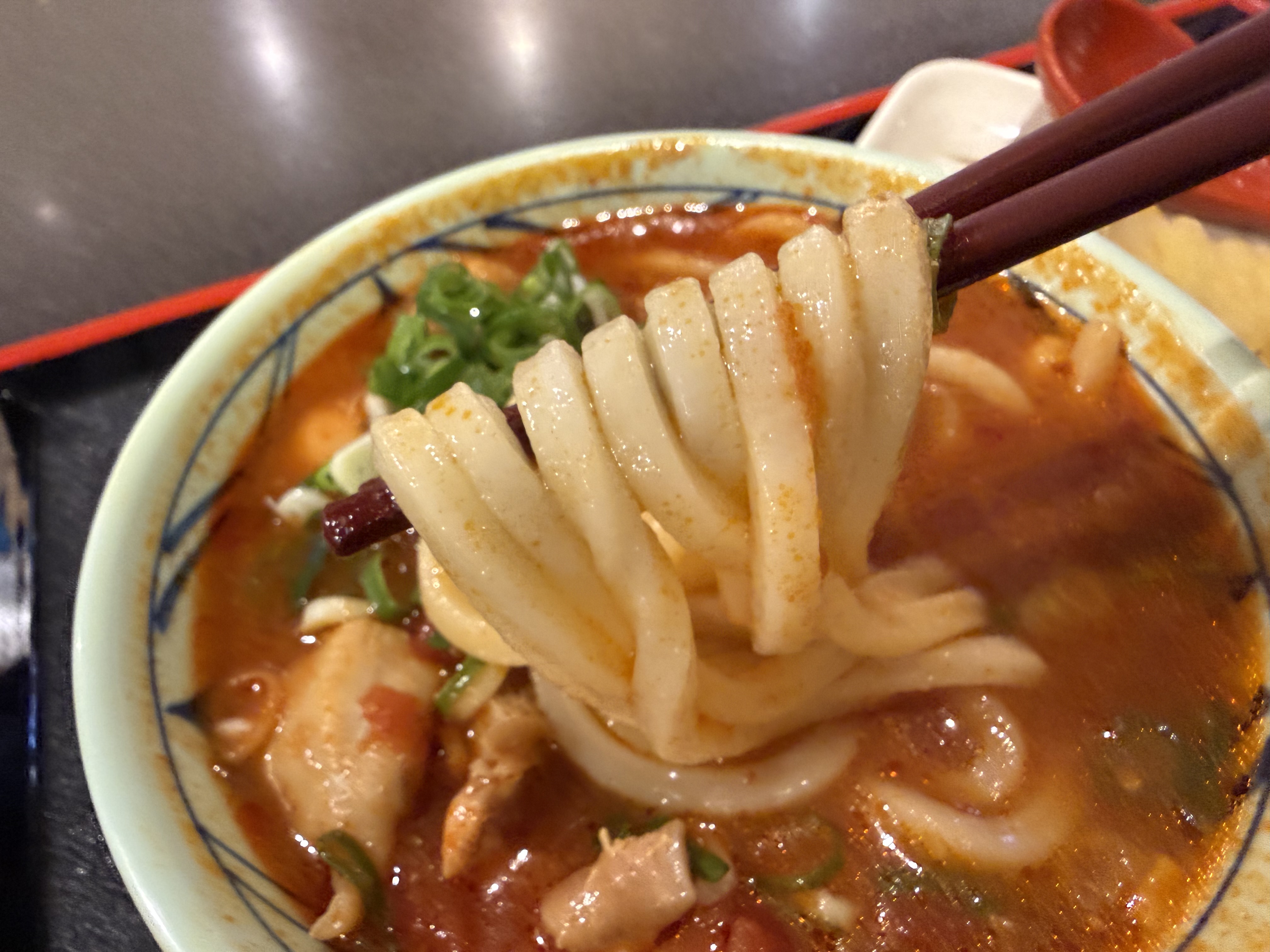 で、注文した「トマト鶏肉うどん」はというと、スープの方向性は香港とほぼ同じ。トマトの甘みと酸味が絶妙な「日本で販売しても絶対に売れる……!」と確信する激ウマスープである。