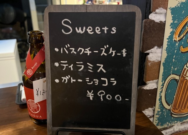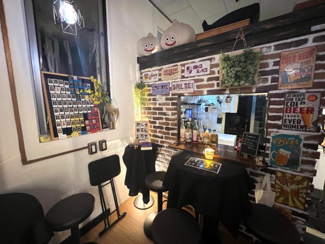 店内はわずか7席。レンガ調の壁にはビールやバイクレースのプレートが飾られている。ドラクエのスライムのぬいぐるみが棚の上からこちらを見つめている。狭いのだが、その狭さが逆に「秘密基地感」を演出していて、なんとも居心地がいい。
