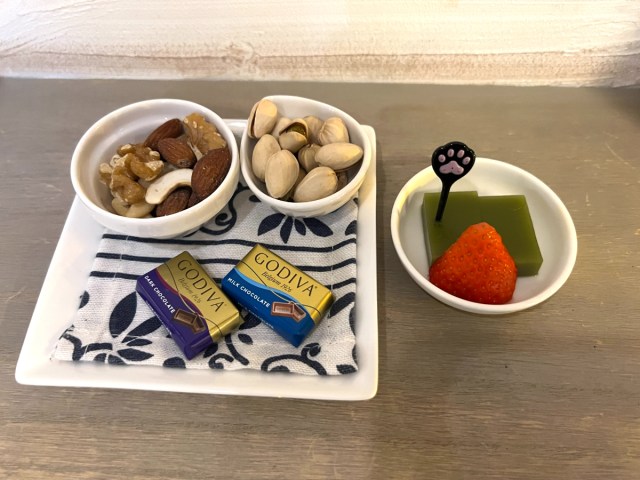 ピスタチオにアーモンド、加えてなんとゴディバのチョコレート。さらに抹茶の羊羹にいちごまで添えられている。BARのお通しでゴディバが出てくるとは……「甘党男子」の名は伊達ではない。