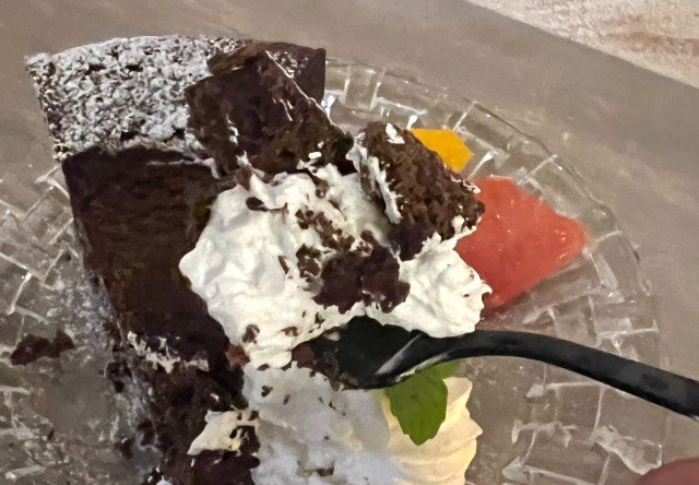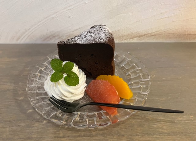 粉砂糖がかかった濃厚なチョコレートケーキに、たっぷりのホイップクリーム、そしてグレープフルーツとオレンジが添えられている。フォークを入れた瞬間、しっとりとした手応えが伝わってくる。