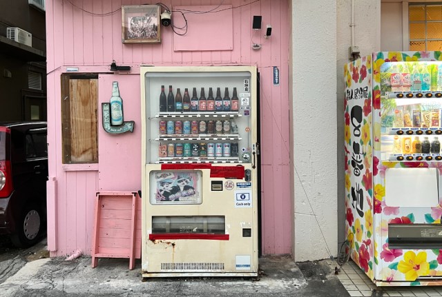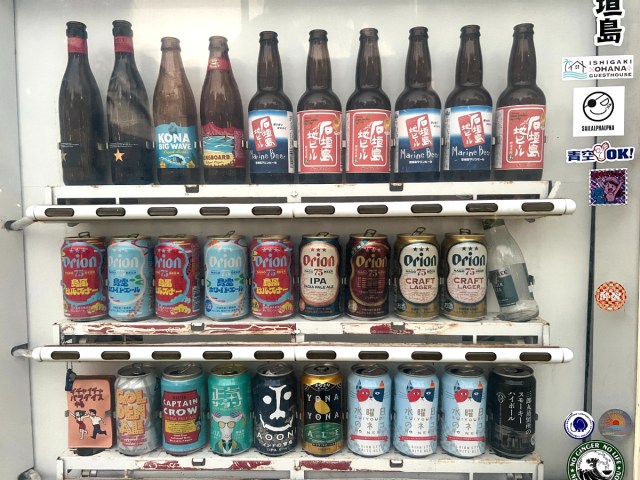 石垣島の中心地、730(ナナサンマル)交差点から市役所通りを歩いていると、クラフトビールや地ビールが並ぶ自販機が目に入ってくる。離島ならではの品揃えに「おっ?」と思いつつ眺めていると、その中に1台だけ明らかに様子がおかしい自販機があった。
