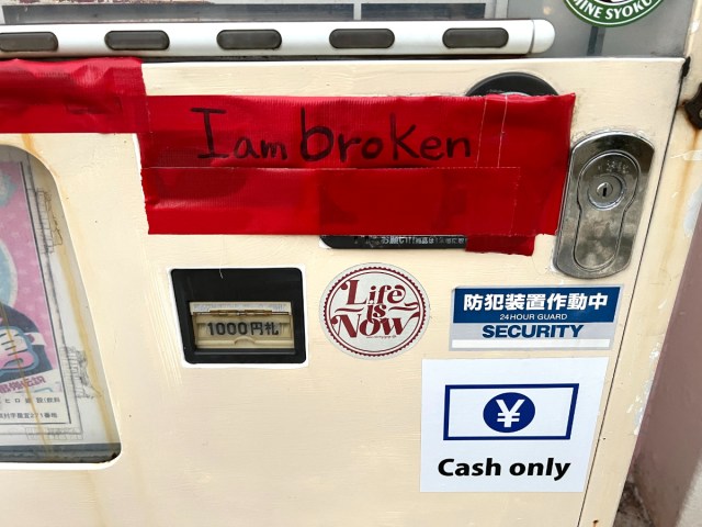 そして紙幣の投入口には赤いテープが貼られ、そこには手書きで「I am broken」と書かれている。「Cash only」のステッカーも貼ってあるし、「1000円札」の表記もある。なのに、壊れているらしい。
