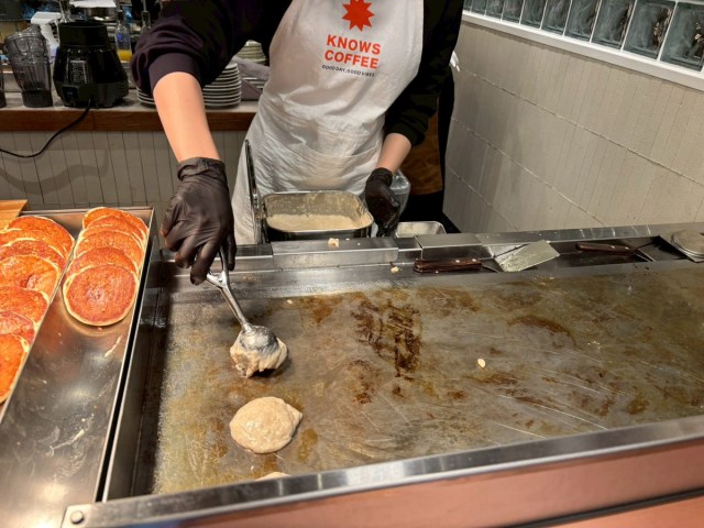 目の前の鉄板でパンケーキを焼くスタイルで、生地がふくらんでいく様子や香りを楽しめる。いわゆるライブ感のあるタイプだ。