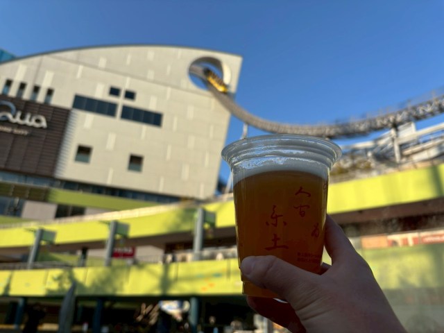 遊園地の乗り物を眺めながらのビールは、なかなかエモいシチュエーションではないだろうか。