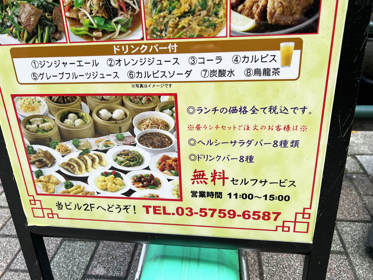 そんな駅前を歩いていたところ、看板に「無料セルフサービス」と書かれた店を発見。これはガチ中華のランチ副菜食べ放題の印! メニューには「ヘルシーサラダバー8種類」「ドリンクバー8種」と書かれている。ドリンクバー飲み放題もついてくるのは珍しい。そこで入店してみることにした。