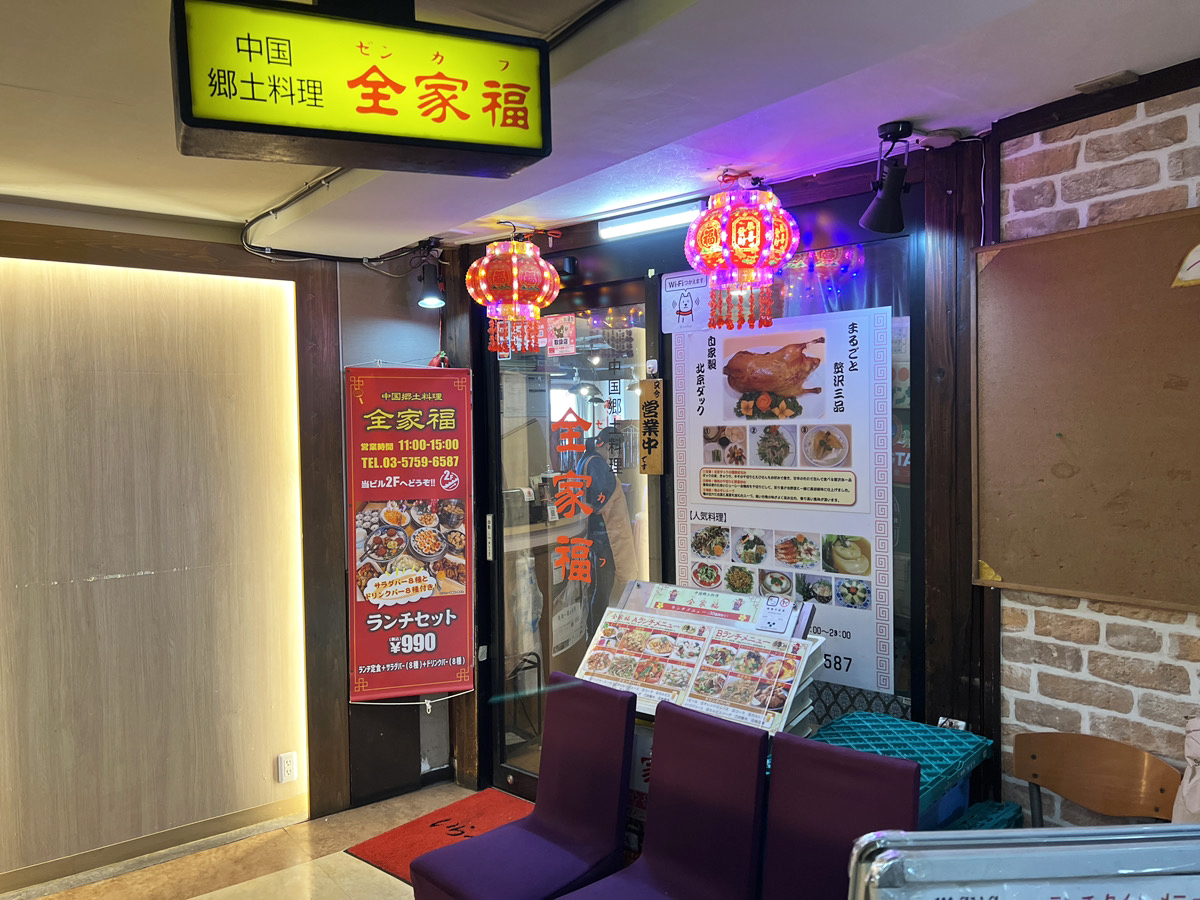 JR目黒駅西口を出て坂を下る途中で見つけたこの看板。どうやら店は、目の前の雑居ビル・セザール目黒の2階にあるらしい。階段を上がって色んな飲食店の中を進むと一番奥に看板のガチ中華店を見つけた。その名も『全家福(ぜんかふ)』である。
