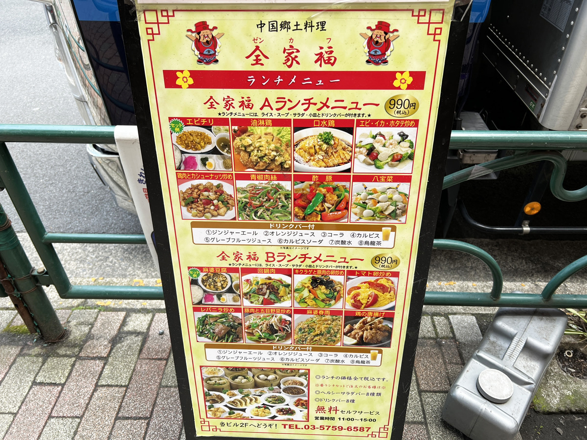 JR目黒駅西口を出て坂を下る途中で見つけたこの看板。どうやら店は、目の前の雑居ビル・セザール目黒の2階にあるらしい。階段を上がって色んな飲食店の中を進むと一番奥に看板のガチ中華店を見つけた。その名も『全家福(ぜんかふ)』である。