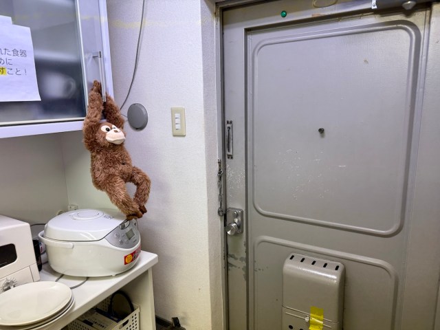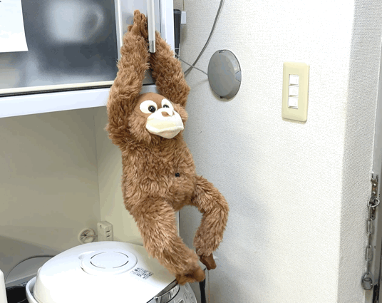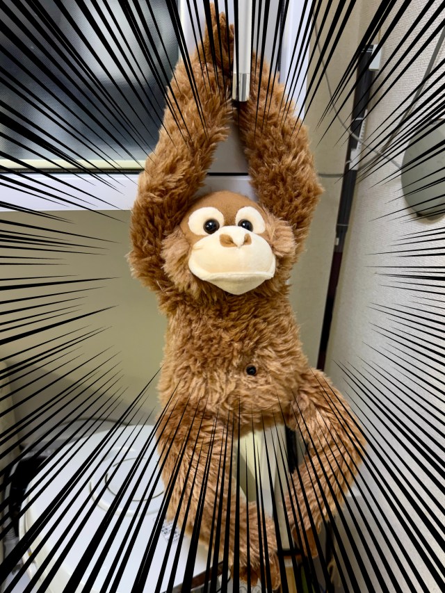 というわけで、編集部の入口にオランウータンを吊るしてスイッチを入れてみると……