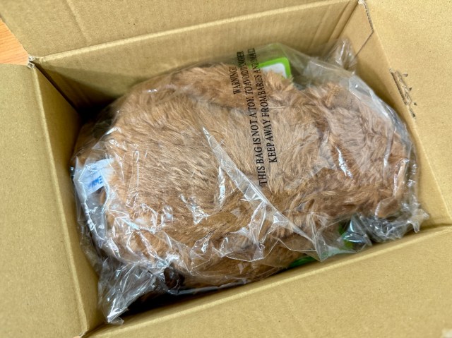 届いた荷物を開封すると、しっかり梱包されたオランウータンが登場。