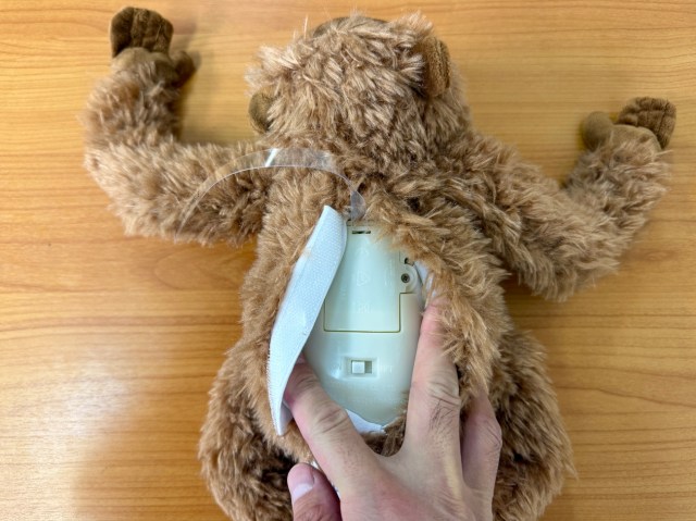 商品説明曰く、おへそ部分のセンサーに人が近づくと、動きを感知してオランウータンが体を震わせながら約10秒間笑うという。手のひらにマジックテープが付いており、好きな場所に吊るすこともできるそうだ。
