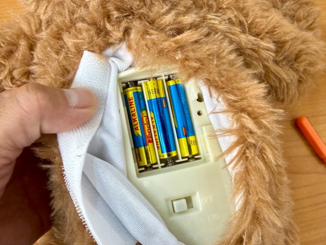 背中をめくって電池ボックスを確認したところ、すでに電池が3本セットされているようだ。保護フィルム(絶縁シート)を抜くだけですぐに使用可能である。