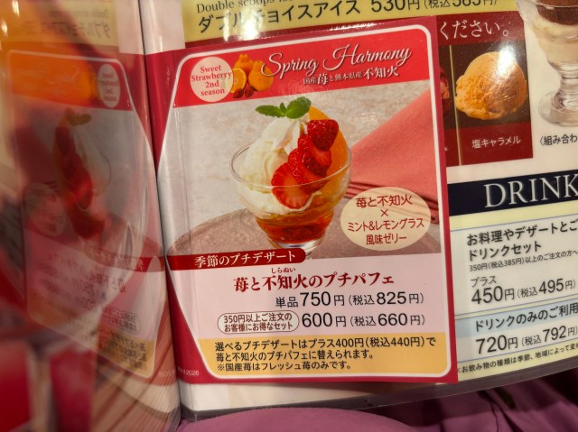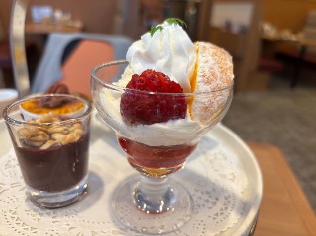 今の季節は「苺と不知火のプチパフェ」で、ミニサイズでもこだわりの味わいでめちゃくちゃ美味しかった。