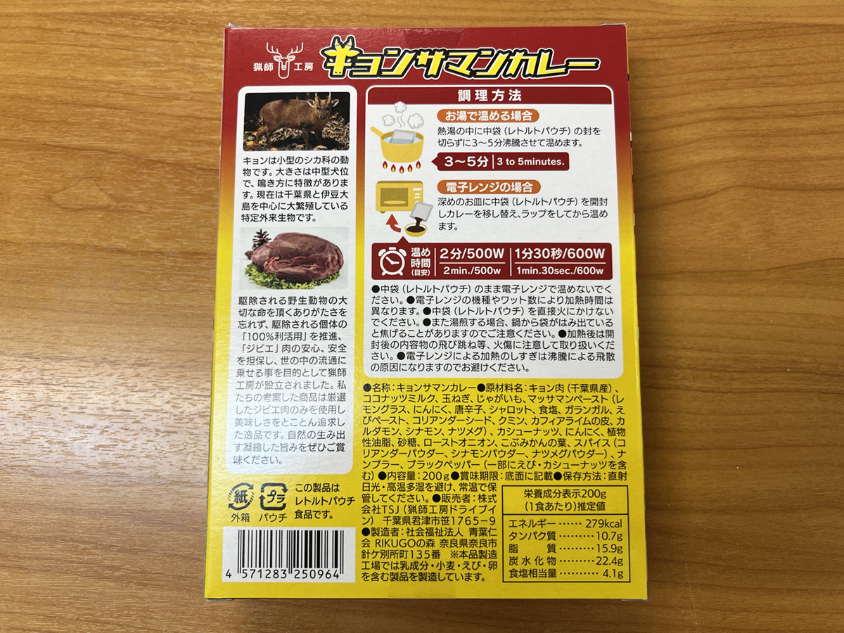 そんな『キョンサマンカレー』は猟師工房ドライブインのYahooオンラインストアで1800円で販売されている。送料も東京で1260円と結構かかるけど、東京から現地まで行ったとしたら交通費が往復6000~7000円くらいかかる場所であることを考えると、体験の対価としては順当な気がする。なにより大企業のチェーンとは違うしな。