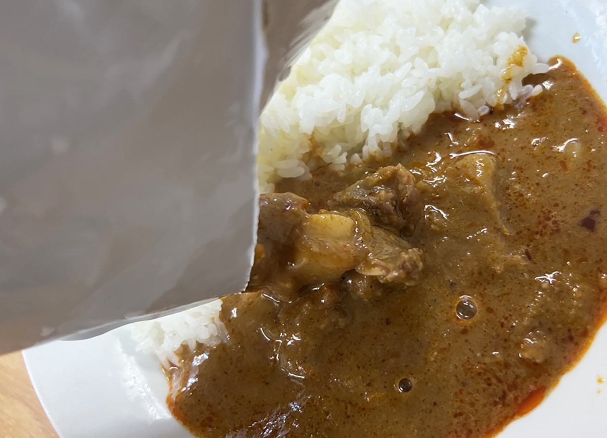 レトルトパウチでパッケージングされたカレーは、ジビエとは言え作り方も普通のレトルトと変わらない。3分~5分湯煎して白米にかけるだけだ。