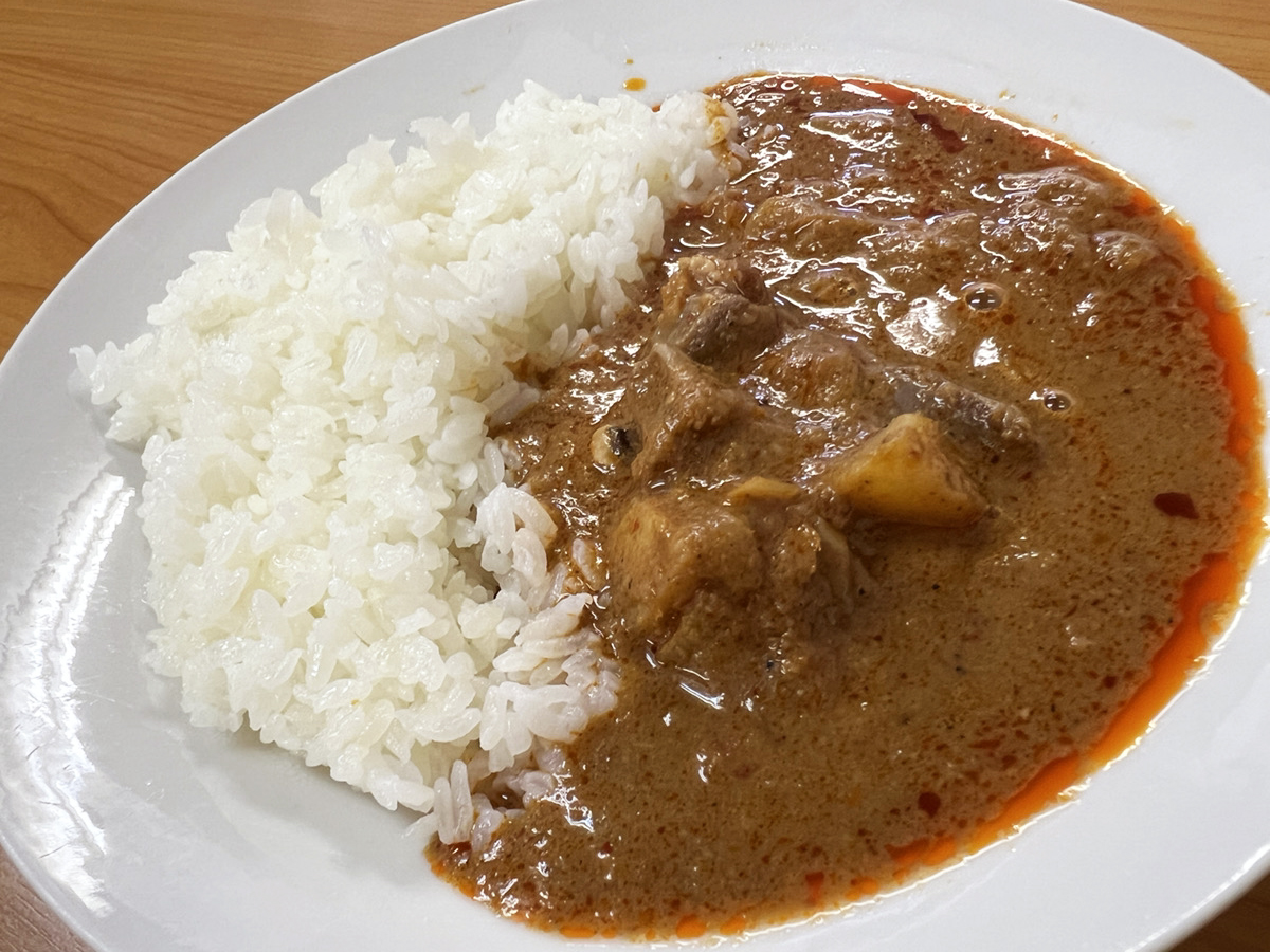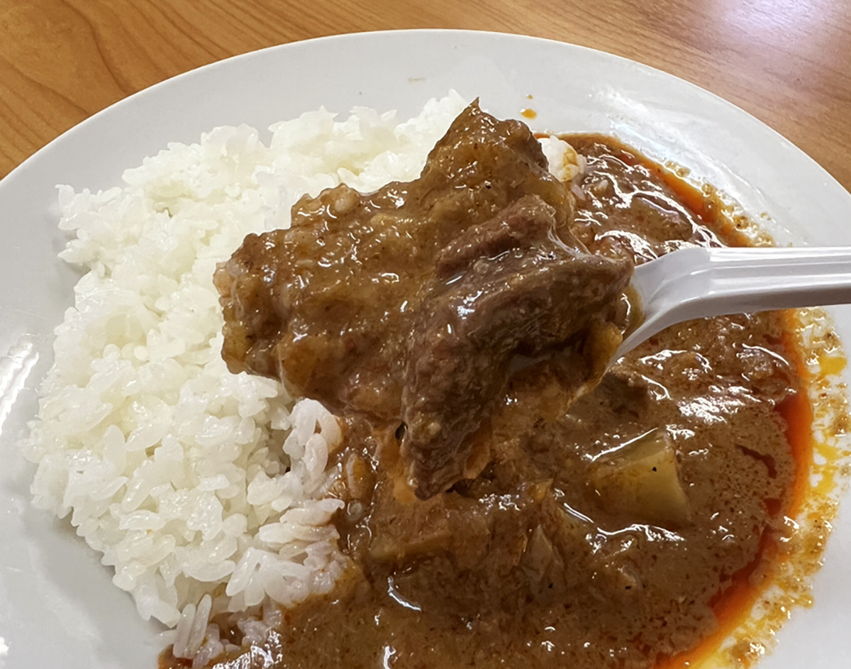 食べてみると、ほぼ鹿肉みたいな味。パサつきや筋張った感じはなく柔らかくて、味的にも臭みやクセはないので、タイ風サラサラカレーとマッチしている。