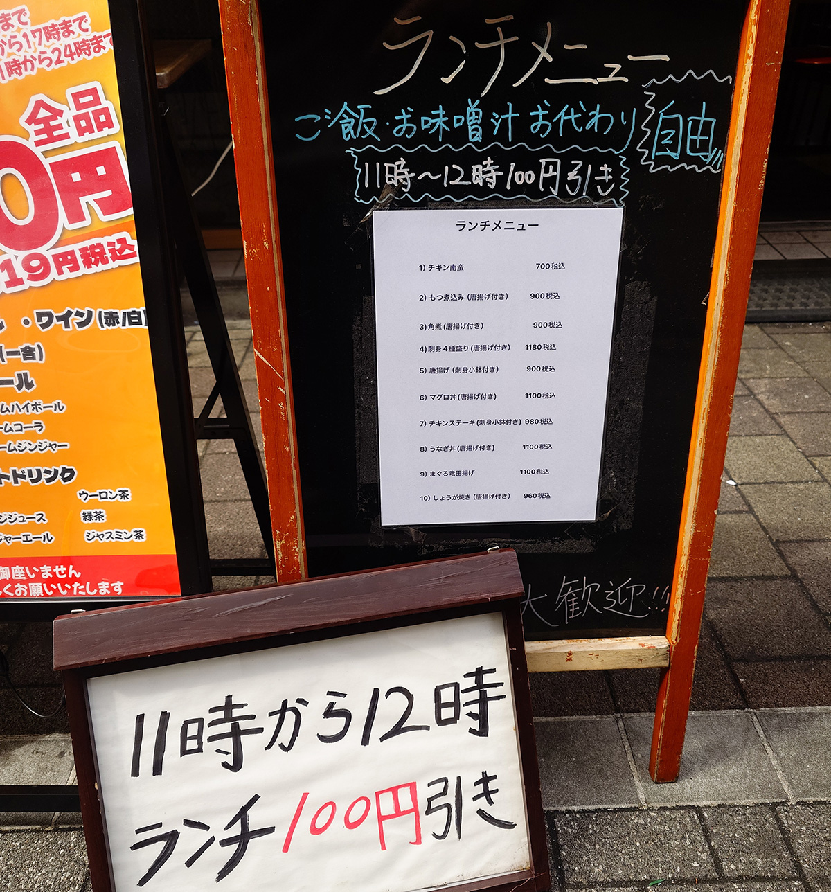 店の外にはランチメニューが。最安はチキン南蛮の700円。高くても、から揚げ付きの刺身4種盛りが1180円。