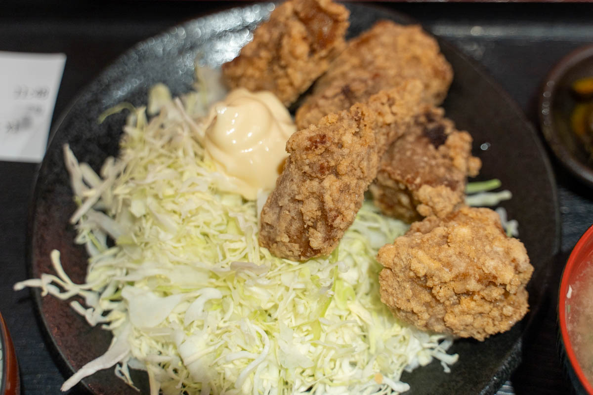 たくさんのキャベツと、いい感じの竜田揚げが5個乗っている。他の付属品はご飯とみそ汁、そして漬物だ。向かいのテーブルのお客さんが写ってしまうので、広い範囲を写した写真は無しでご容赦を。