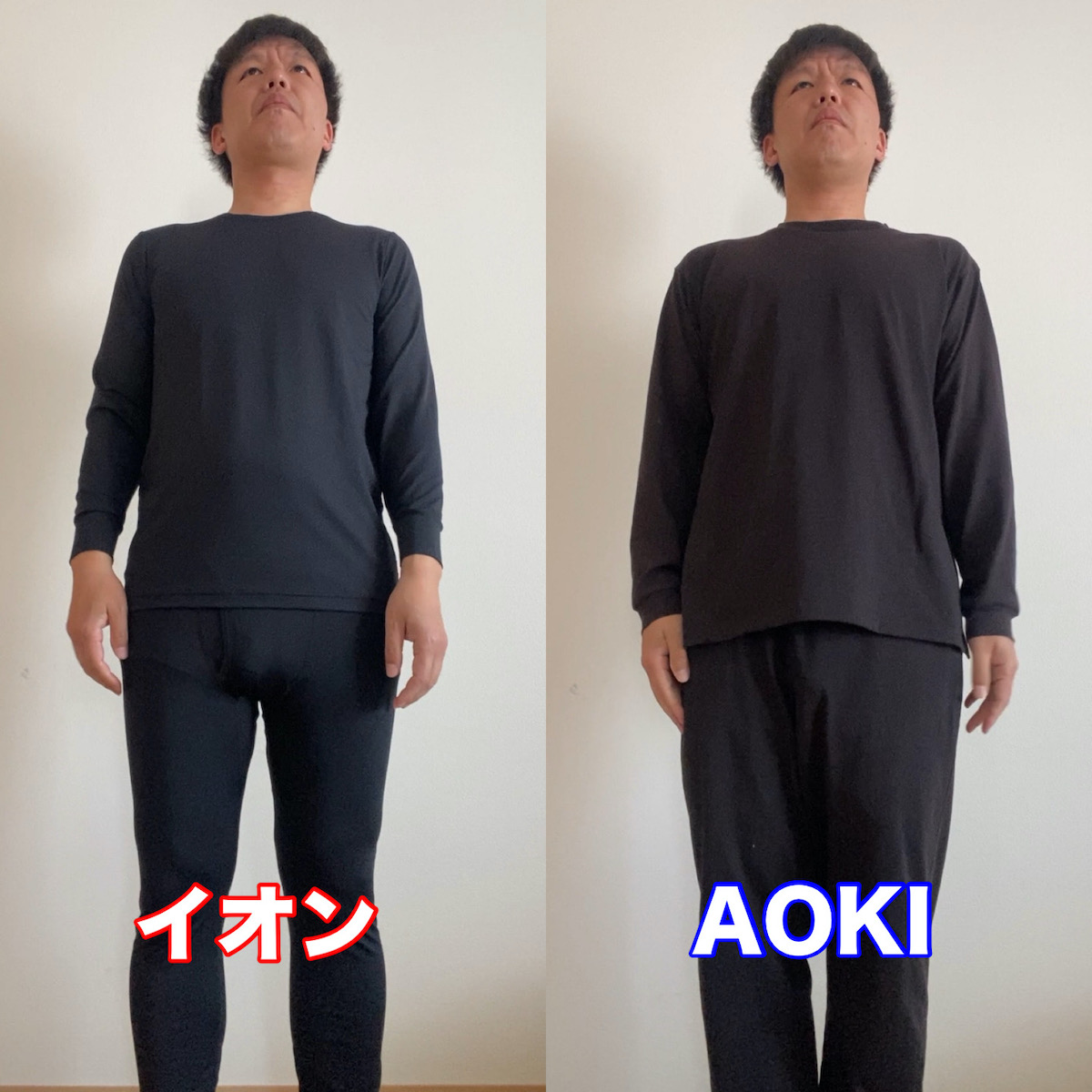 これでの外出はかなり難易度が高いかも。実際にAOKIと着比べたらこの通りで、タイツを着て外出している人に見える可能性大。ルームウェアというよりはインナー寄りのものだと考えた方が無難だろう。