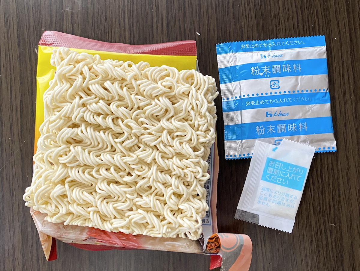 それでは実際に食べてみよう。開封するとこんな感じで乾麺・粉末調味料・調味オイルの “いつもの” セットが入っていた。