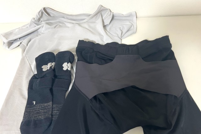 現在、シャツ4枚、スパッツ3枚、ソックス4足を所有。できれば7セット揃えて毎日替えたいのだが、全部揃えると約20万円コース。なかなか追加購入する勇気が出ない。