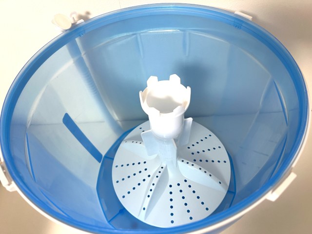 フタを開けると底面にはパルセーター(回転翼)がついている。ここに洗濯物と水と洗剤を入れて、ハンドルを回すと水流が発生する仕組みだ。