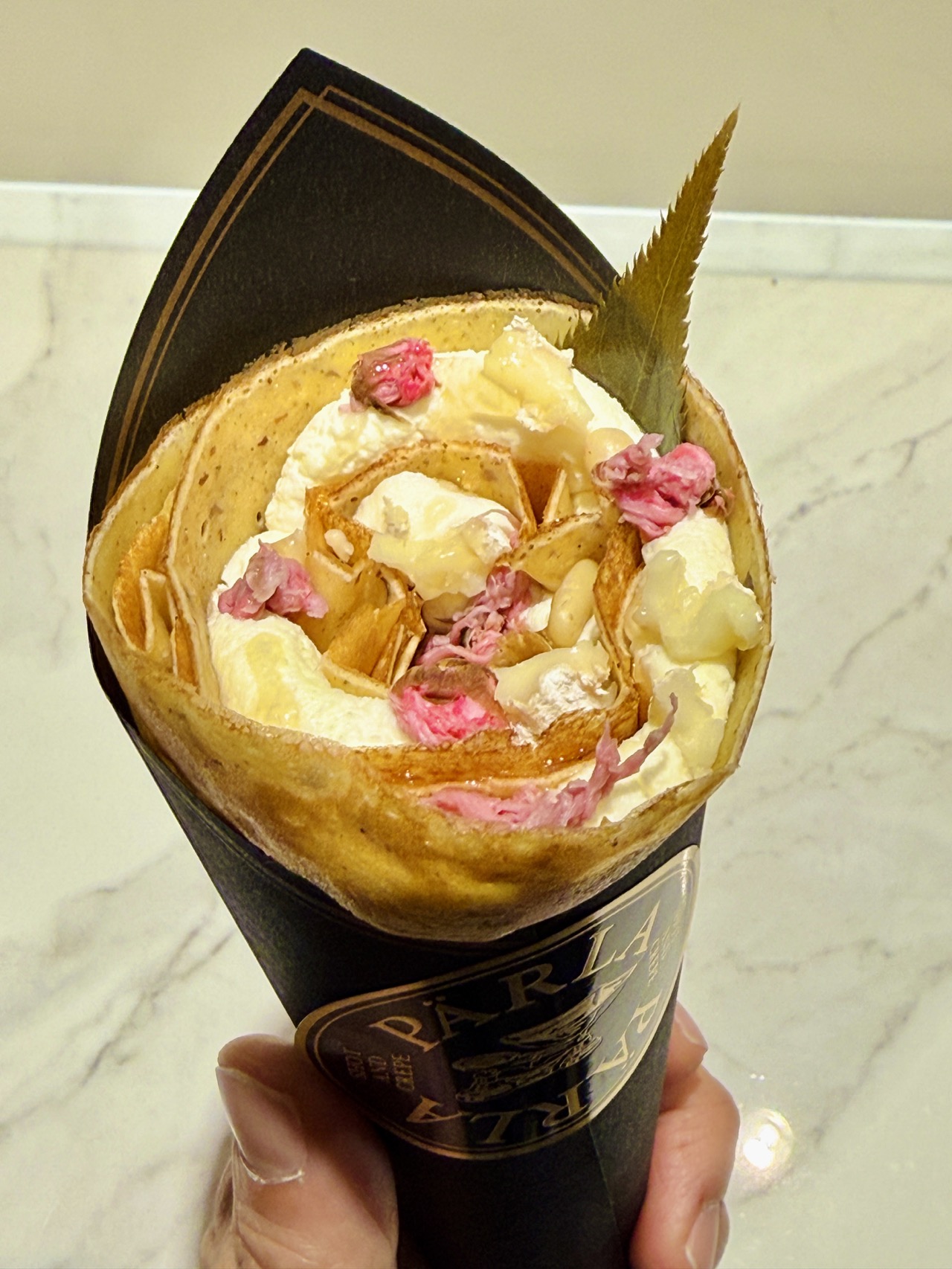 ハイエンドなクレープスタンド「PÄRLA(パーラ)」の期間限定商品『桜ブリー・ド・モー』。感動的に美味。私含め、その場にいた客3人が、それぞれ「おいしかったです……」と店主に感想を伝えていたほどの完成度。最高!