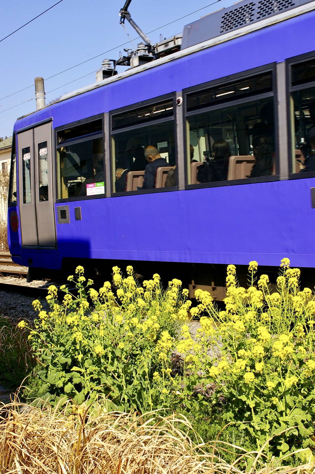 その昔、下高井戸に住んでいたこともあり、世田谷線沿いをお散歩。すると線路脇に菜の花がチョイチョイ咲いていたのでパチリ。席に座る紳士が眠そうに見えるのも、車内と春のポカポカ温度によるものなのかもしれない。