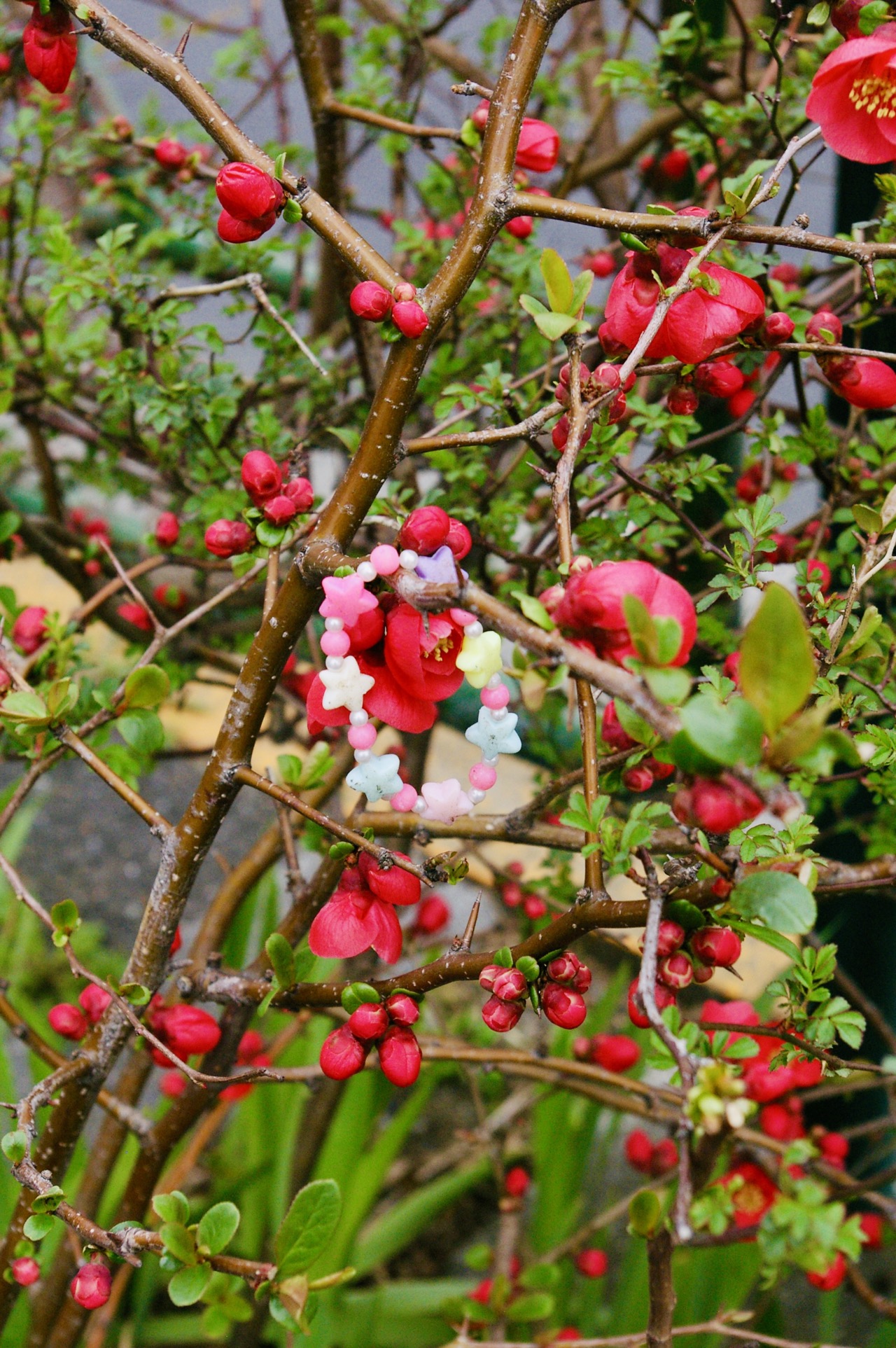 場所は荻窪の、普通の歩道。なんとなく道端に生えている花木を見たら、おそらく落とし物であろう、可愛らしいブレスレットがかけられていた。なんて優しい配慮なのだろう。ちなみに赤い花は「ボケ(木瓜)」という。