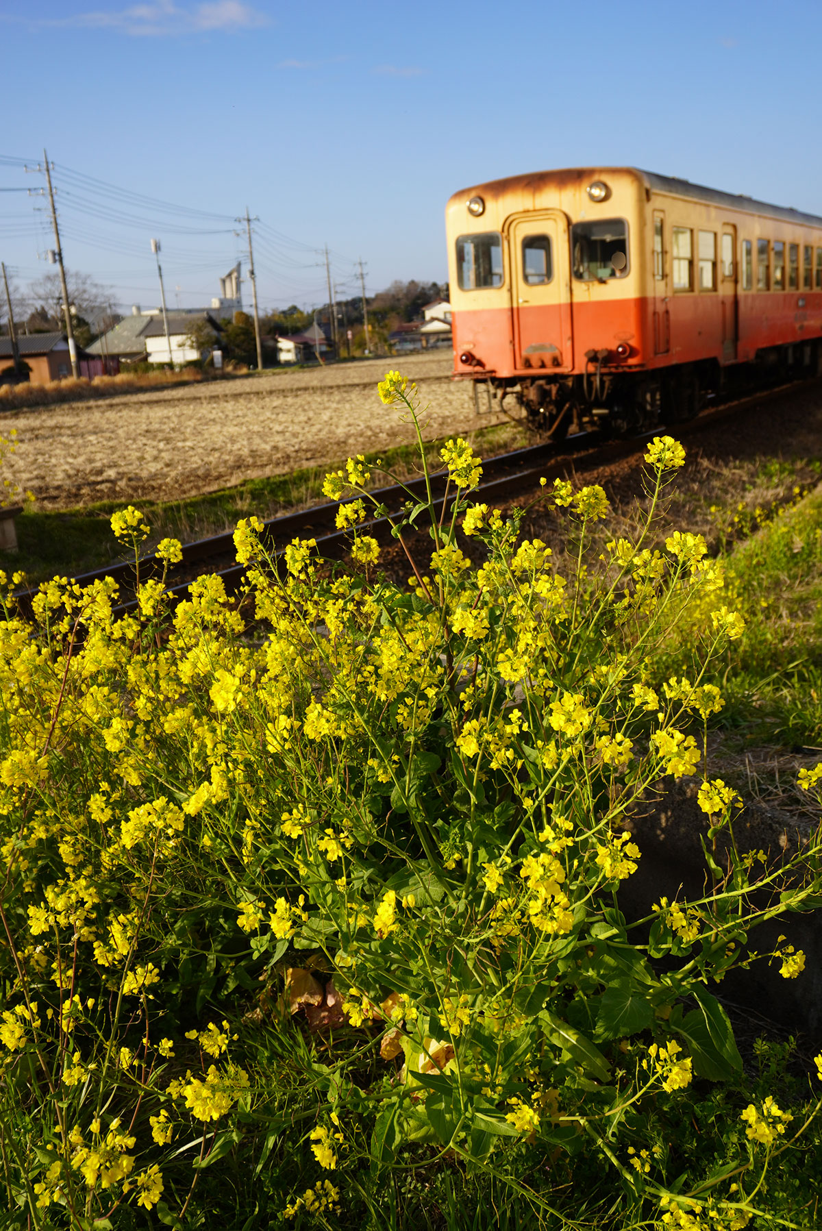 「青空と線路と菜の花」