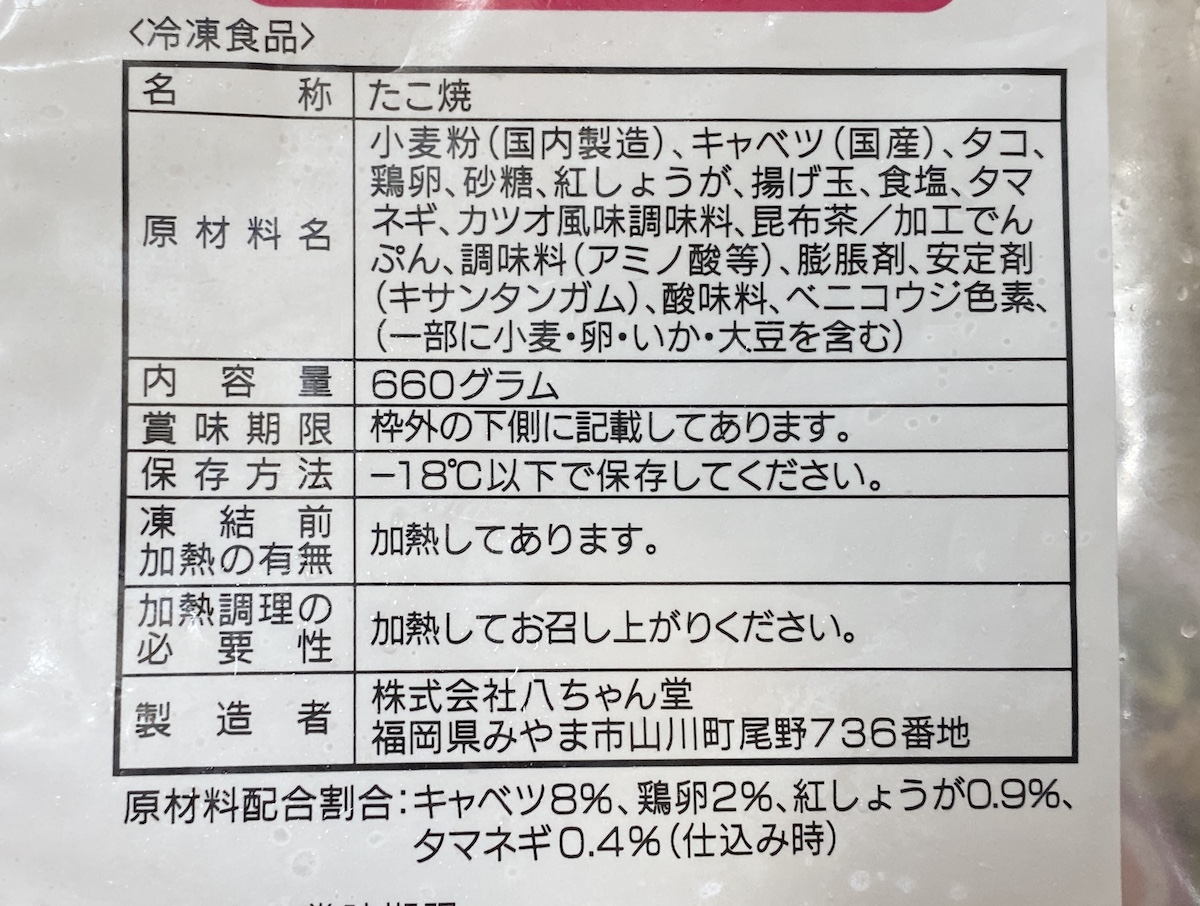 冷凍たこ焼きは1個あたり20gがオーソドックスな重量だが、スーパーで売られていた「八ちゃん堂」の冷凍たこ焼きは22個入りで660g……つまり、1個あたり30gと大玉だったのだ。