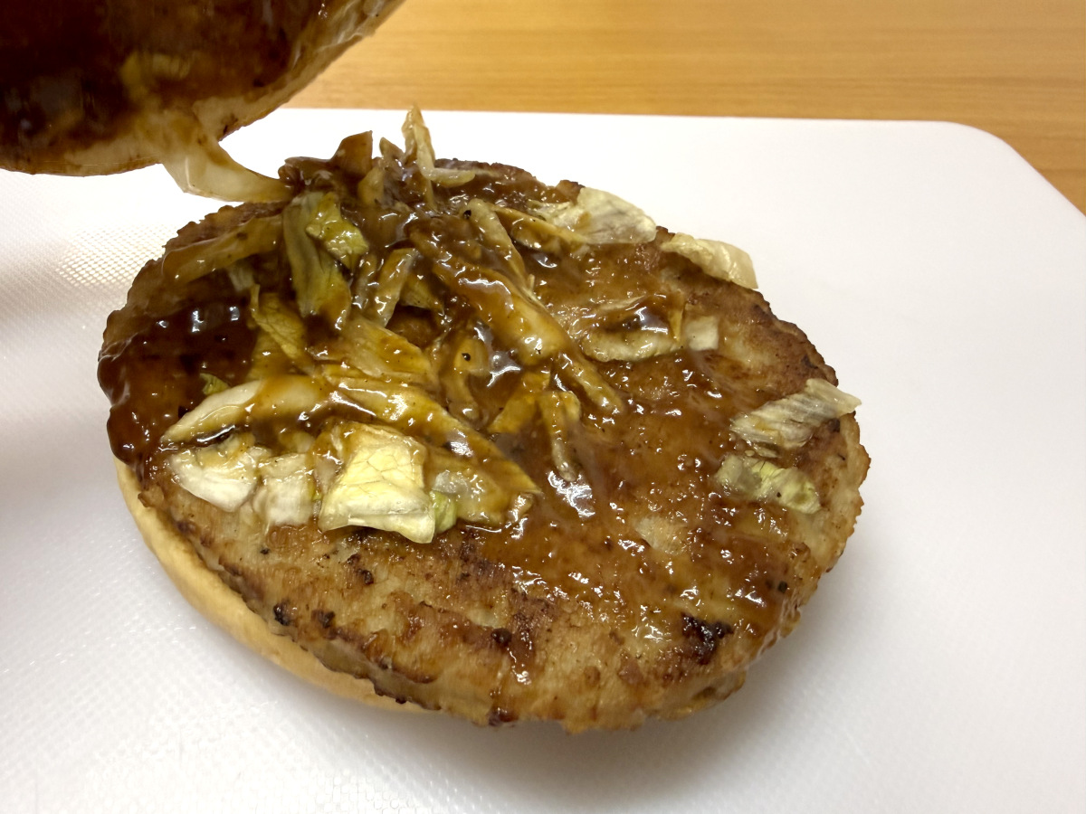 さっそく食べてみると、確かにそのまま食べるよりかなりマイルドでウマい! とげとげしさすら感じたガーリックペッパーソースが一気に丸くなり、ポークパティの味自体もだいぶ感じやすくなった。