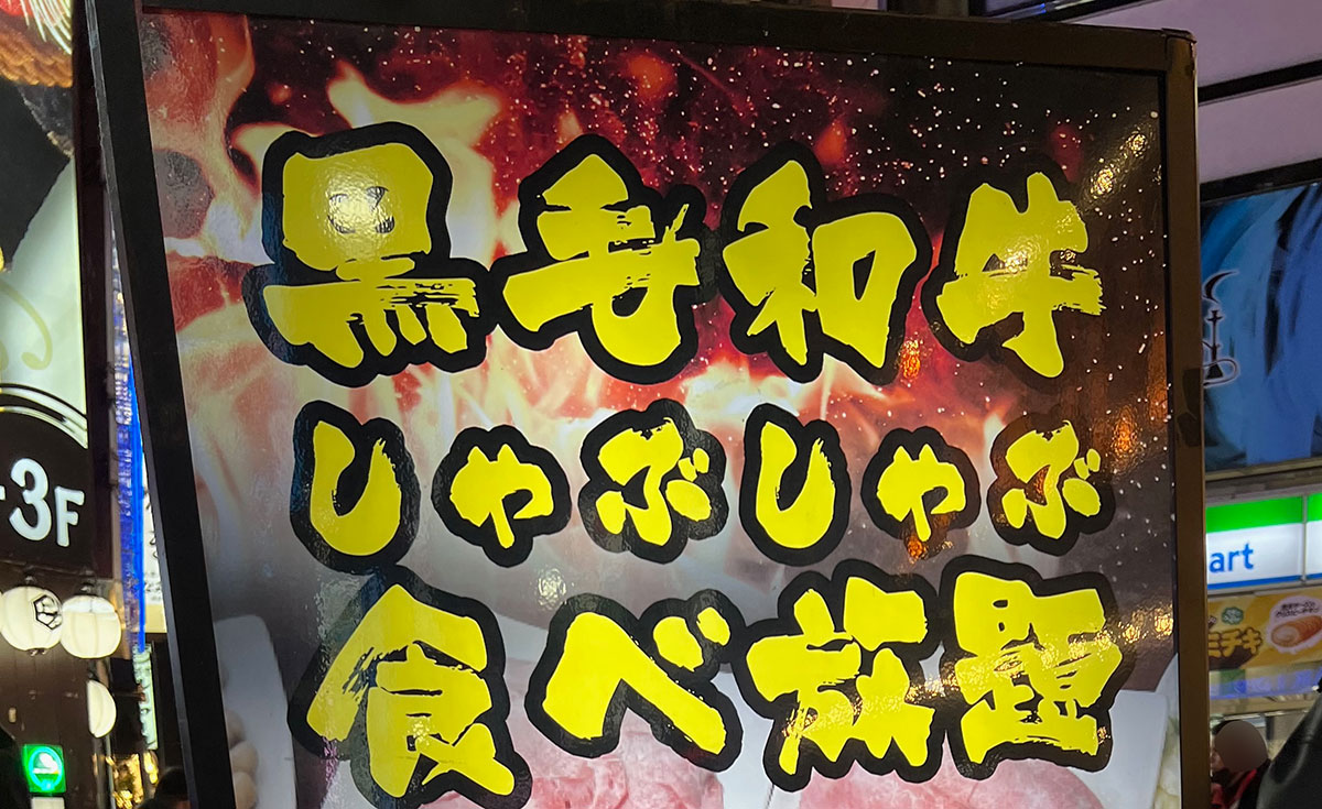 そんなときに見つけた「黒毛和牛・しゃぶしゃぶ食べ放題」の看板。無視できるはずがない。